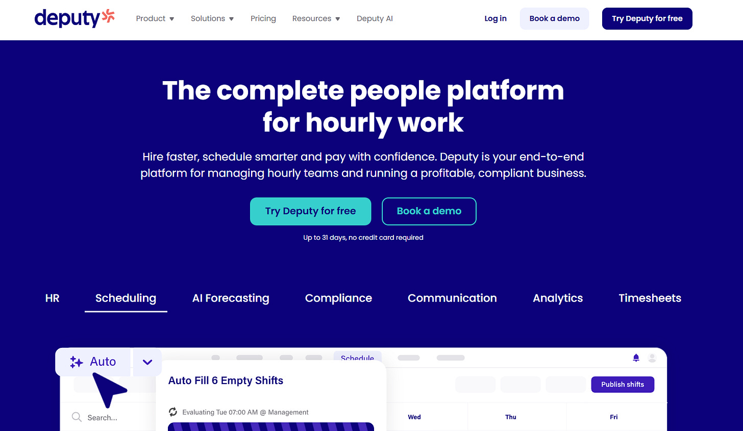 Deputy is a robust platform with auto-scheduling capabilities that factor in labor rules, costs, and time off policies. It’s a strong choice if you’re looking to reduce scheduling conflicts while staying aligned with payroll and HR workflows.