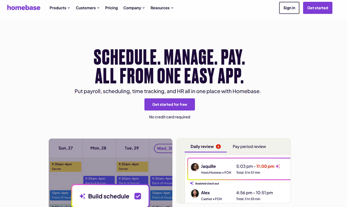 Homebase makes scheduling approachable with a free plan and straightforward tools. You get shift planning, a time clock, simple reports, and basic notifications: ideal if you’re just getting started and don’t need dozens of advanced features.